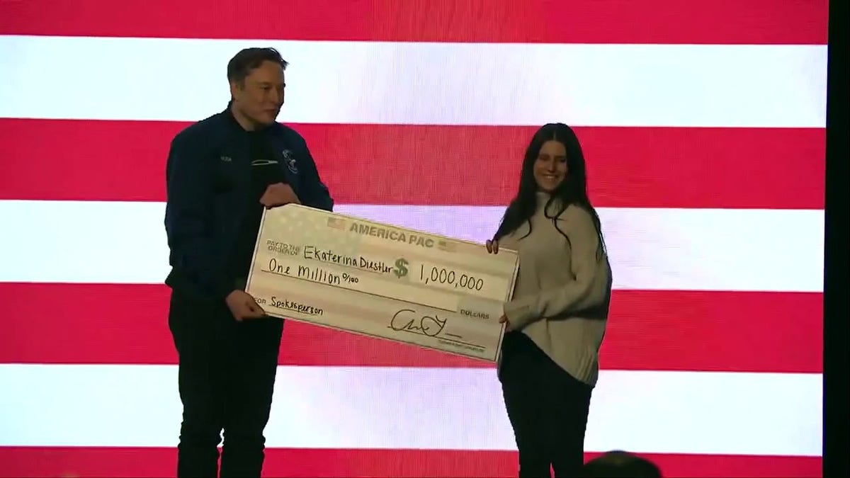 Elon Musk, chief executive officer of Tesla Inc., right, presents a one-million dollar check to an attendee during an America PAC town hall ahead of the Wisconsin Supreme Court election. (Getty Images)