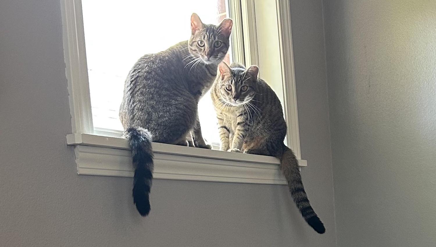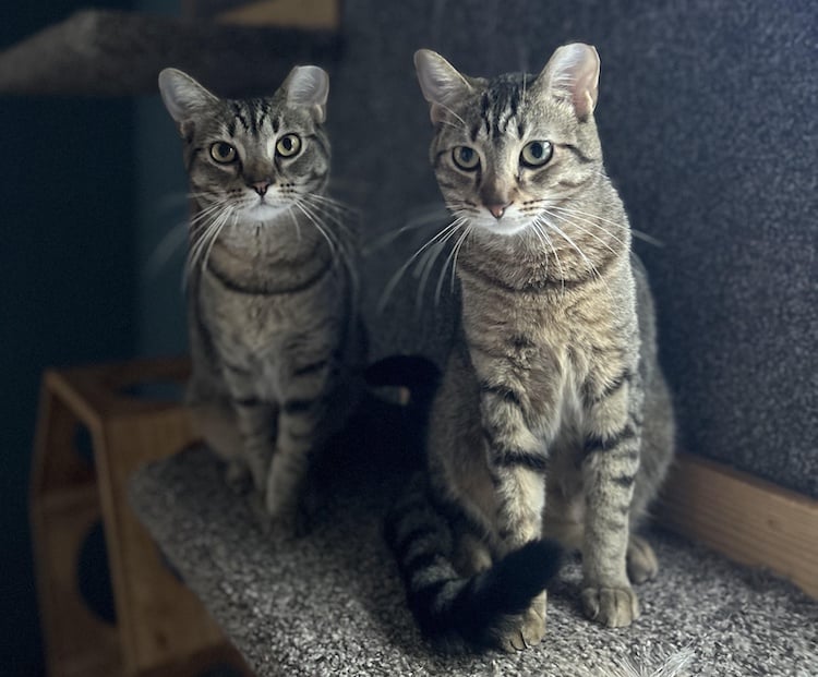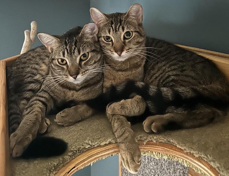 Meet Phoenix (m) and Rebel (f), a dynamic duo of playful tabbies who are looking for a forever home to call their own! These two are a bonded pair and must be adopted together because where one goes, the other is sure to follow. They take their hangout time together very seriously.