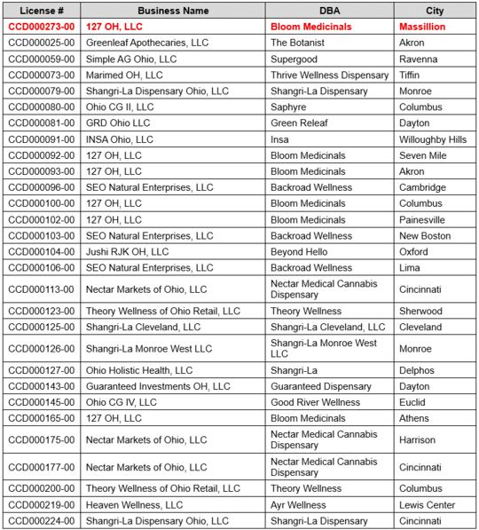 Affected Product Sold at the Following Dispensaries:
