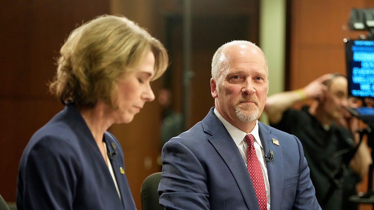 Wisconsin Supreme Court candidates Brad Schimel and Susan Crawford are seen before a televised debate Wednesday, March 12, 2025, in Milwaukee. (AP Photo/Morry Gash)