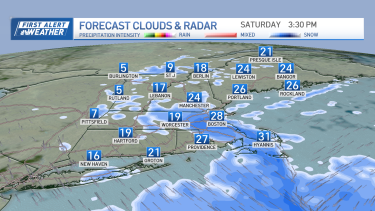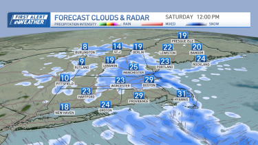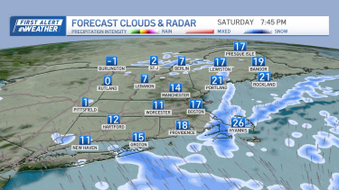 Friday is a transitional day, as we get light snow to flurries due to ocean effect offshore and along the coast through the day. Temps will be in the 20s to near 30, with cloudy skies for everyone in New England. Tonight’s lows drop to the teens and 20s, with incoming snow out in western New England.