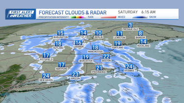 The First Alert Weather Team has issued a First Alert for Saturday’s snow. The updated snow map (issued Friday at 11am) shows an increase in totals at the coastline. This is due to a Norlun trough and ocean effect that typically enhances lift and therefore, snowfall.
