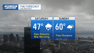 Sunday isn’t much better, but it is warmer…by a smidge. We sneak into the milder air for a few hours around midday. There will still be a few passing showers, with a trend toward drying in the afternoon. Temperatures will fall back through the 40s and 50s as some rays of sun poke out late.