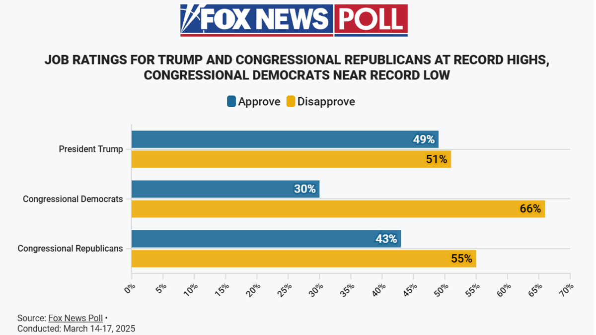 Additionally, the latest Fox News National poll, which was released last week, indicated congressional Democrats’ approval rating at 30%, near an all-time low. And Democrat activists are irate over their party’s inability to blunt President Donald Trump’s agenda.