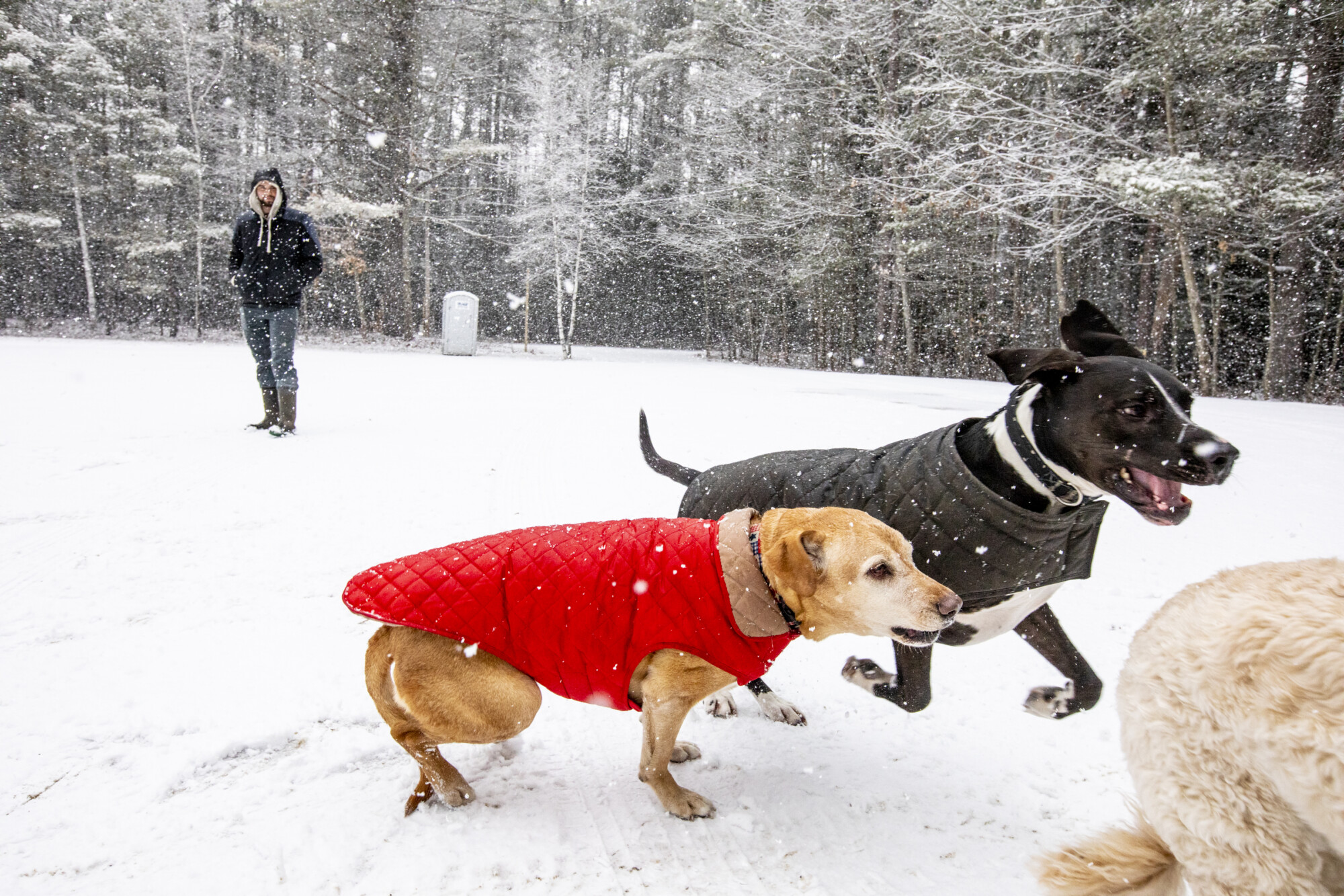Cameron Gross’ dogs Gus and Chelsea, of Hanover, chase Juno, owned by Pam Freeman, of Bethel (not pictured), at Valentine Farm on North Road in Bethel in December 2022. (Rose Lincoln/Bethel Citizen)