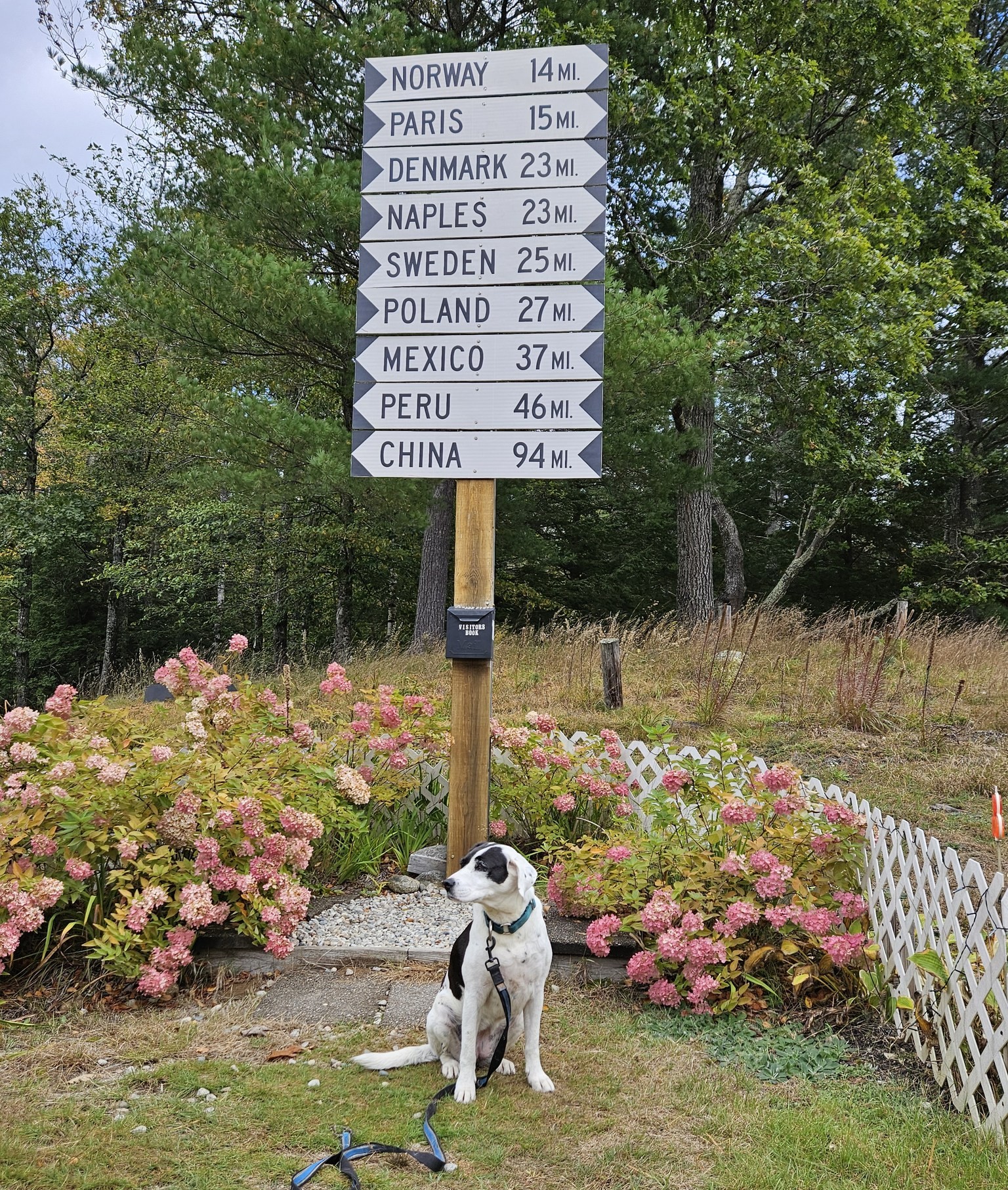 Norway resident Carissa Daniels urges dog lovers to pose their dogs at iconic spots around Maine, including the World Traveler Signpost, an Albany Township attraction that dates back to the 1930s. Tink, pictured here, is one of Daniels’ many dogs that go to fun places around Oxford Hills. (Courtesy of Carissa Daniels)