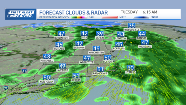 Overnight, a surge of warmth kicks up our temps to the 40s and 50s south on a gusty south wind. Scattered rain moves through overnight and into the Tuesday morning commute. The showers move out by midday as a west wind keeps us in the 40s and 50s for highs on a westerly breeze.