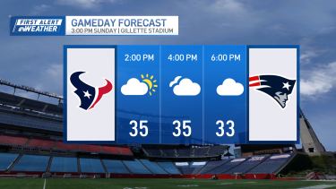 The Patriots game should come away unscathed. No snow, no rain, no wind, and no sun. Temps will be in the mid-30s.