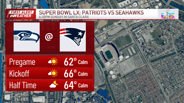 By total contrast, out west, California continues to see pleasant weather, south of a jet stream and ridging, and therefore temps are in the 60s for Super Bowl Sunday. Game time and throughout will be comparatively sweaty, with temps in the low to mid 60s through halftime under a partly cloudy sky.