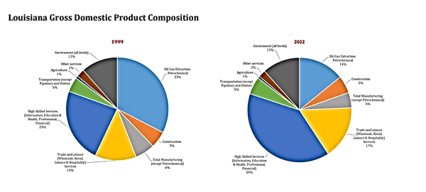 “The oil and gas industry has a hold on the popular imagination, our self-image and our politics that is way disproportionate to their actual economic impact and their impact on actual communities,” said Jan Moller, executive director of the Invest in Louisiana, a nonpartisan economic think tank.