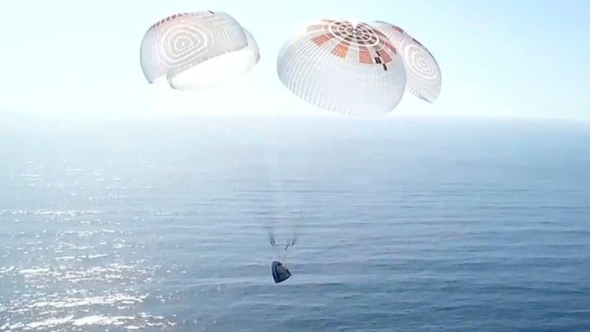 A Dragon capsule carrying four space tourists prepares to splash down in the Pacific Ocean off the coast of California on Friday, April 4, 2025. (SpaceX via AP)