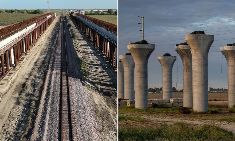 The massively slow and expensive construction of the California bullet train project is photographed in Corcoran, California, left, and Hanford, California, right. (Robert Gauthier/Los Angeles Times via Getty Images | George Rose/Getty Images)
