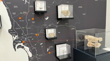 A wall-size map of Southern California with mounted jewel cases containing fossils educates the young and the old by linking the ancient animals to where they were dug up around San Diego County. Photo by Eric S. Page