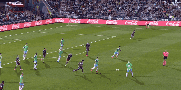 This is the ideal Sounders build-up sequence in 2024. Lightning quick movement from back to front gets the defense sprinting toward their own goal. Ragen breaks lines, Morris receives the ball dropping off the back line, and Rusnák is in the right place for one-touch distribution to the wing.